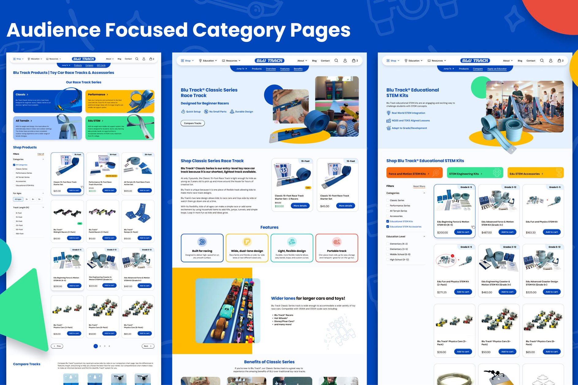 Families couldn’t easily compare track series or confirm which products were compatible with the cars they already owned. Educators had no clear path to curriculum-aligned kits, classroom resources, or the institutional purchasing options — purchase orders, tax-exempt checkout — that schools require. A single navigation structure was sending everyone through the same experience, and it wasn’t working for anyone.