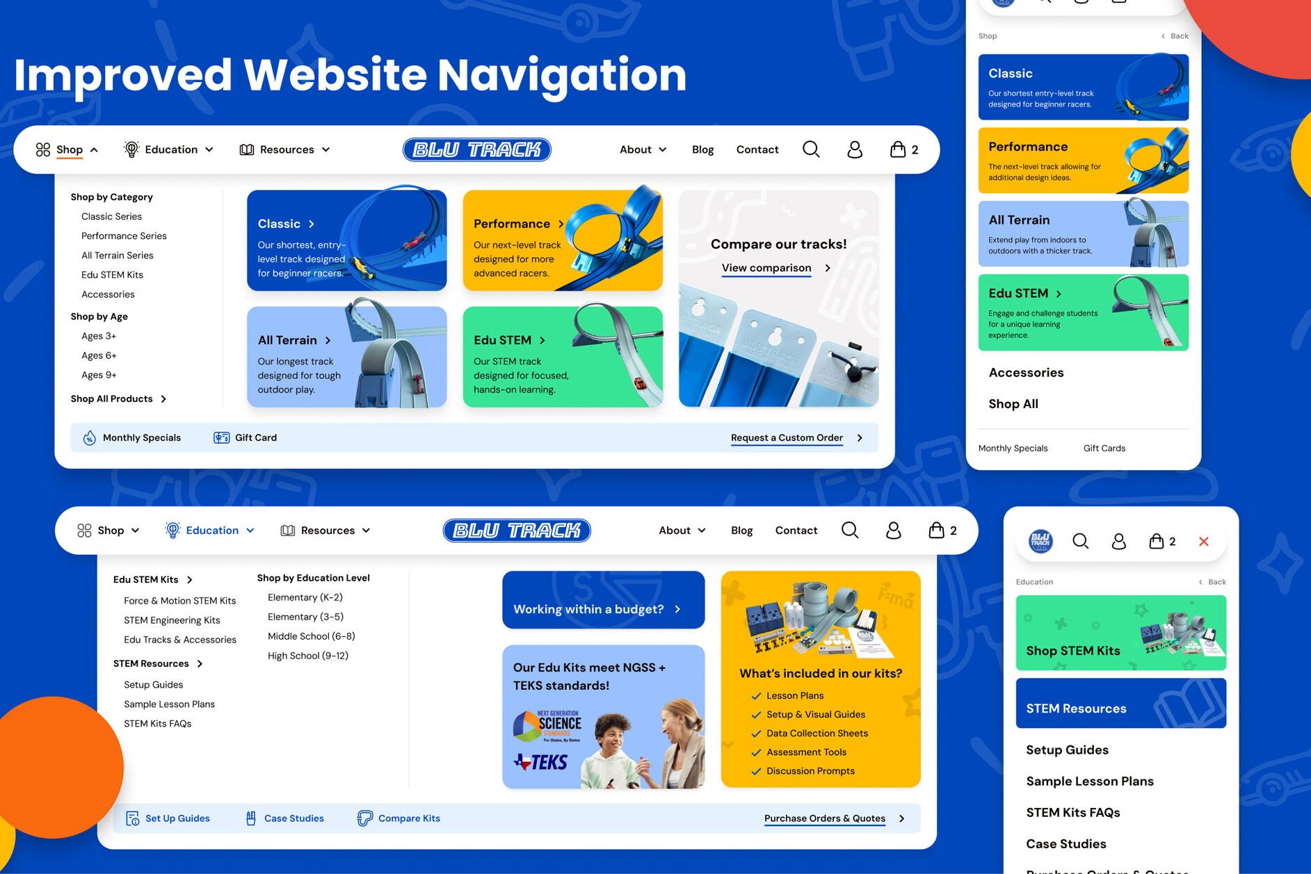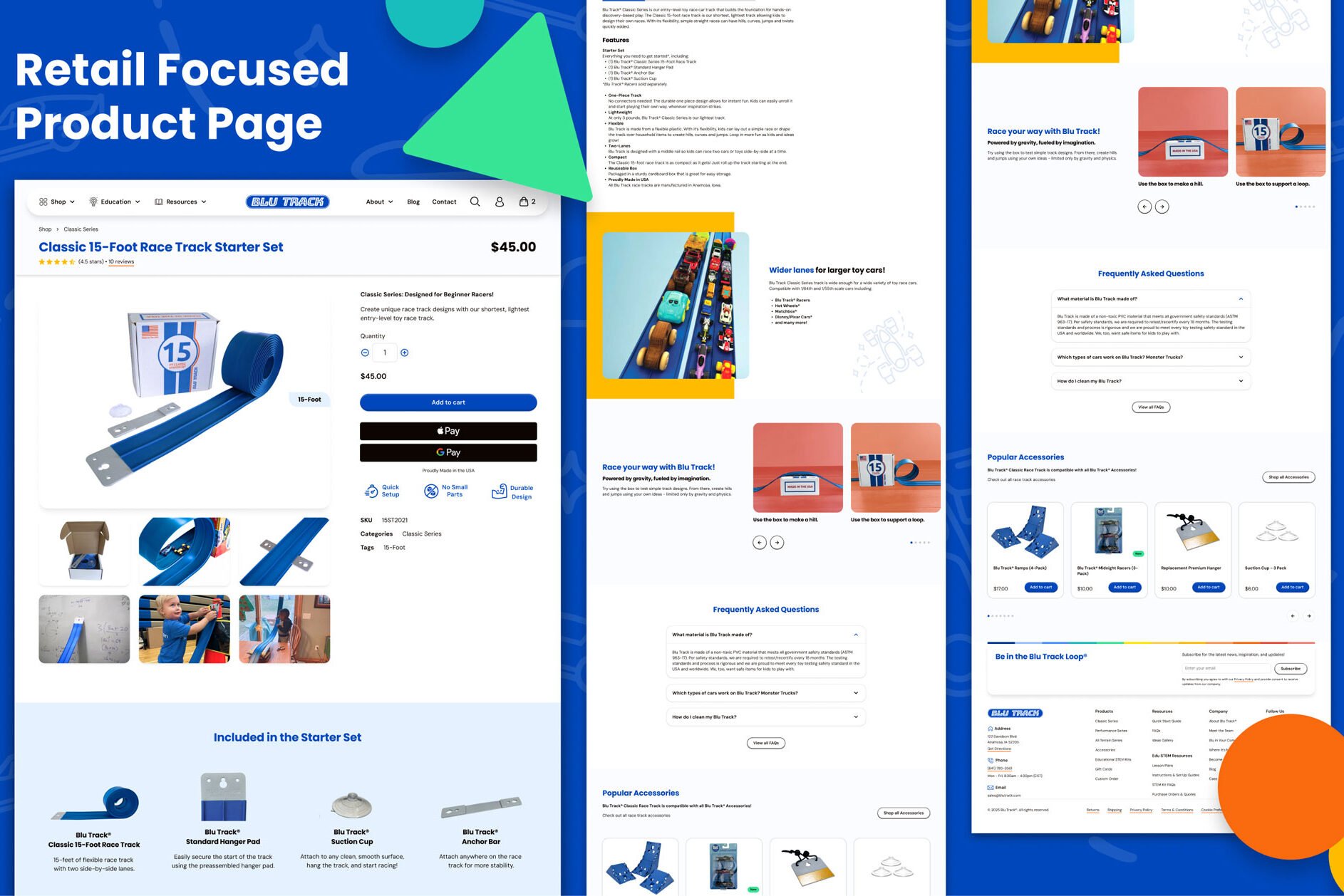 Blu Track makes flexible two-lane racetracks and STEM kits that bridge the gap between play and structured learning. Based in Anamosa, Iowa, they serve families, teachers, wholesalers, and public libraries — all through a single website that needed to work for every one of them.
