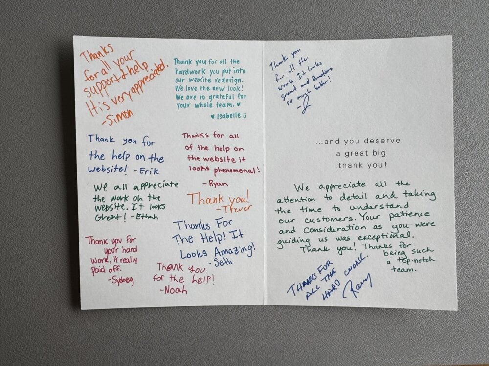 We worked most closely with Amy Belding, Communications Specialist, and Isabelle Edwards, Brand Manager, throughout both phases — from initial discovery through launch and beyond. The thank you card we received from the Blu Track team says it better than we can!